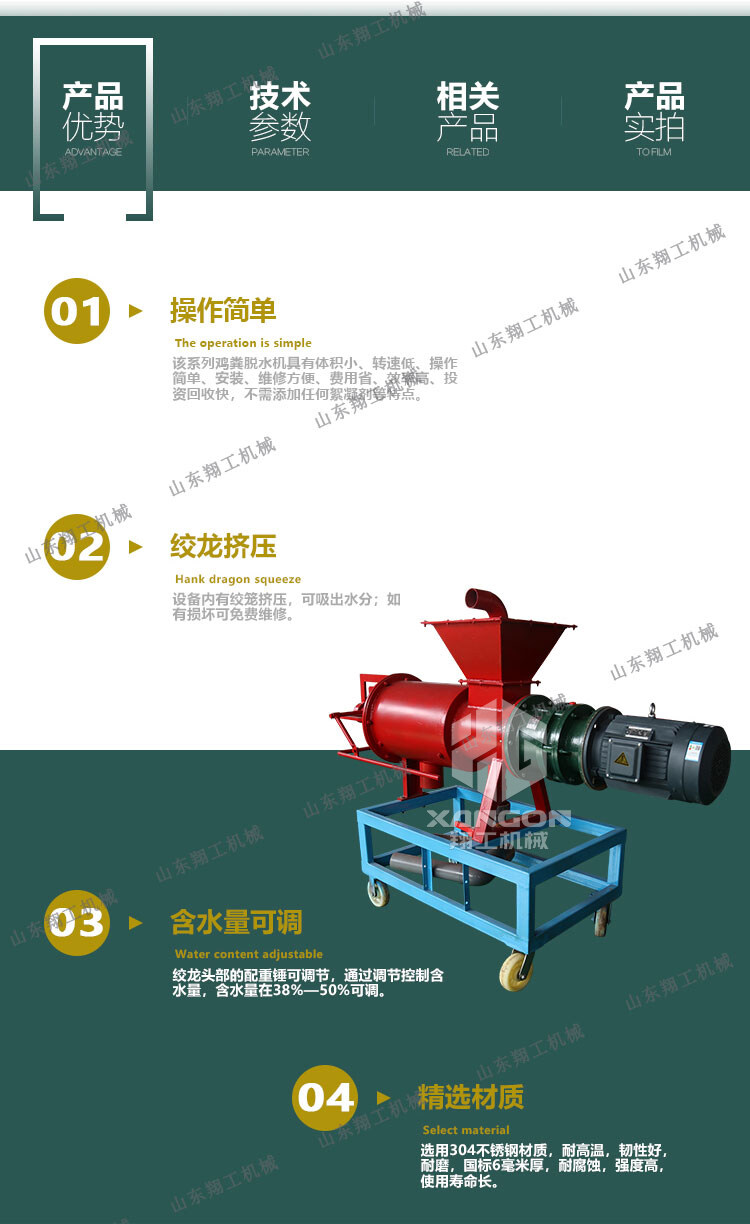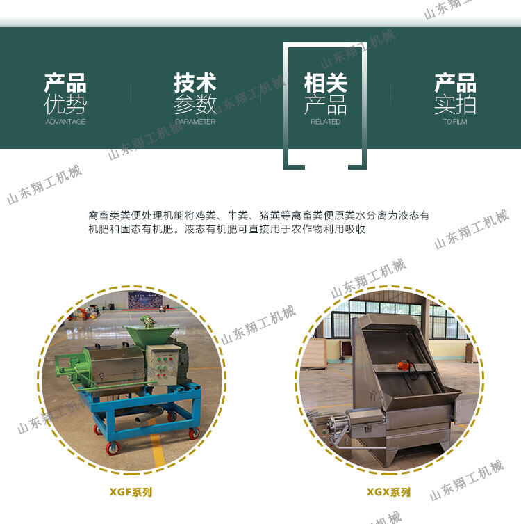 該系列雞糞脫水機具有體積小、轉速低、操作簡單、安裝、維修方便、費用省、效率高、投資回收快,不需添加任何絮凝劑等特點;該機采用的螺旋軸、篩網(wǎng)為不銹鋼制作;禽畜類糞便處理機能將雞糞、牛糞、豬糞等禽畜糞便原糞水分離為液態(tài)有機肥和固態(tài)有機肥;液態(tài)有機肥可直接用于農(nóng)作物利用吸收;固態(tài)有機肥可運到缺肥地區(qū)使用,也可起到改觀土壤結構的作用,同時經(jīng)過處理可制成有機復合肥。