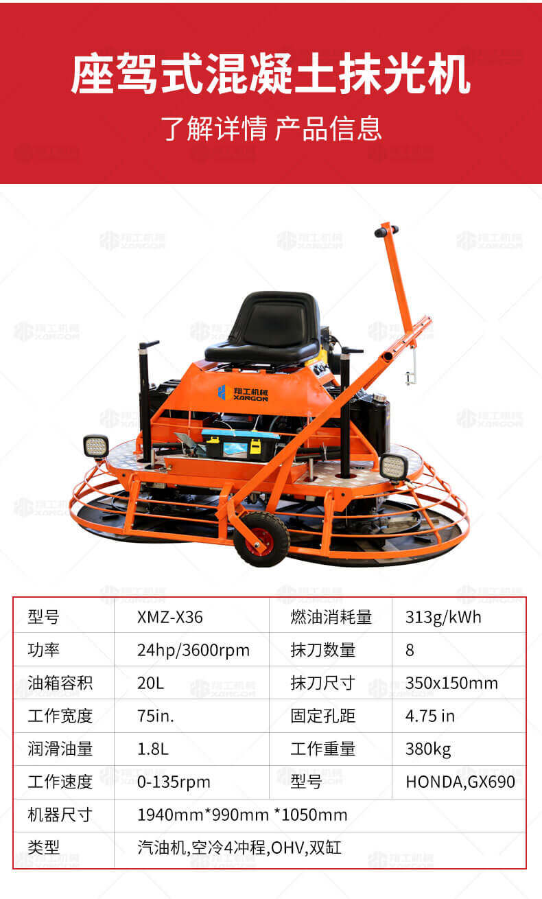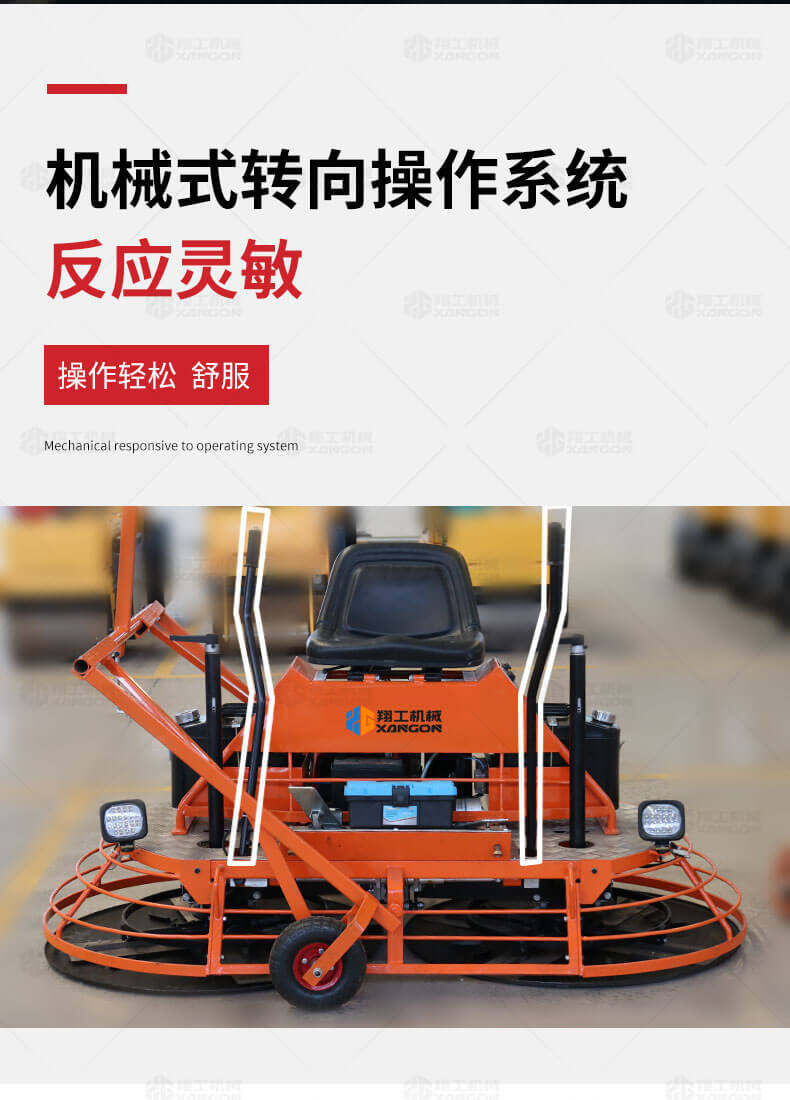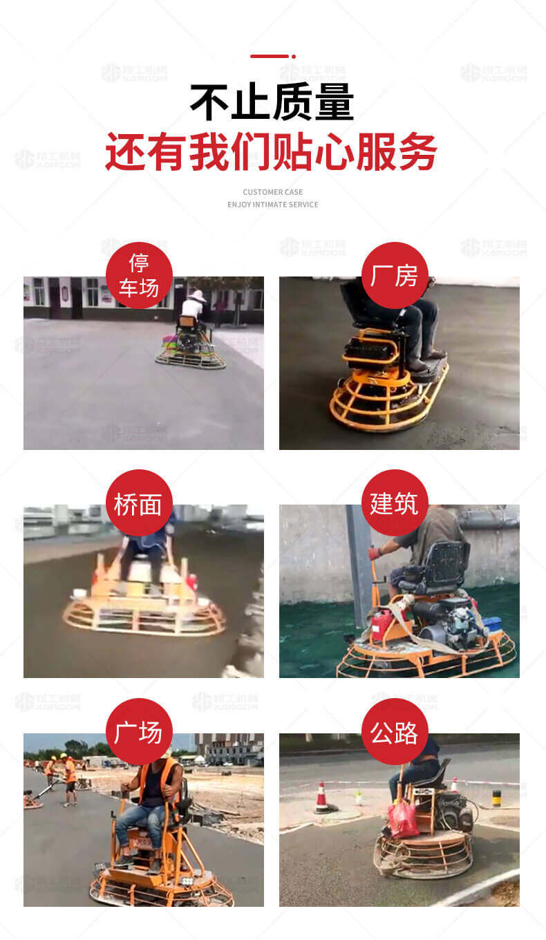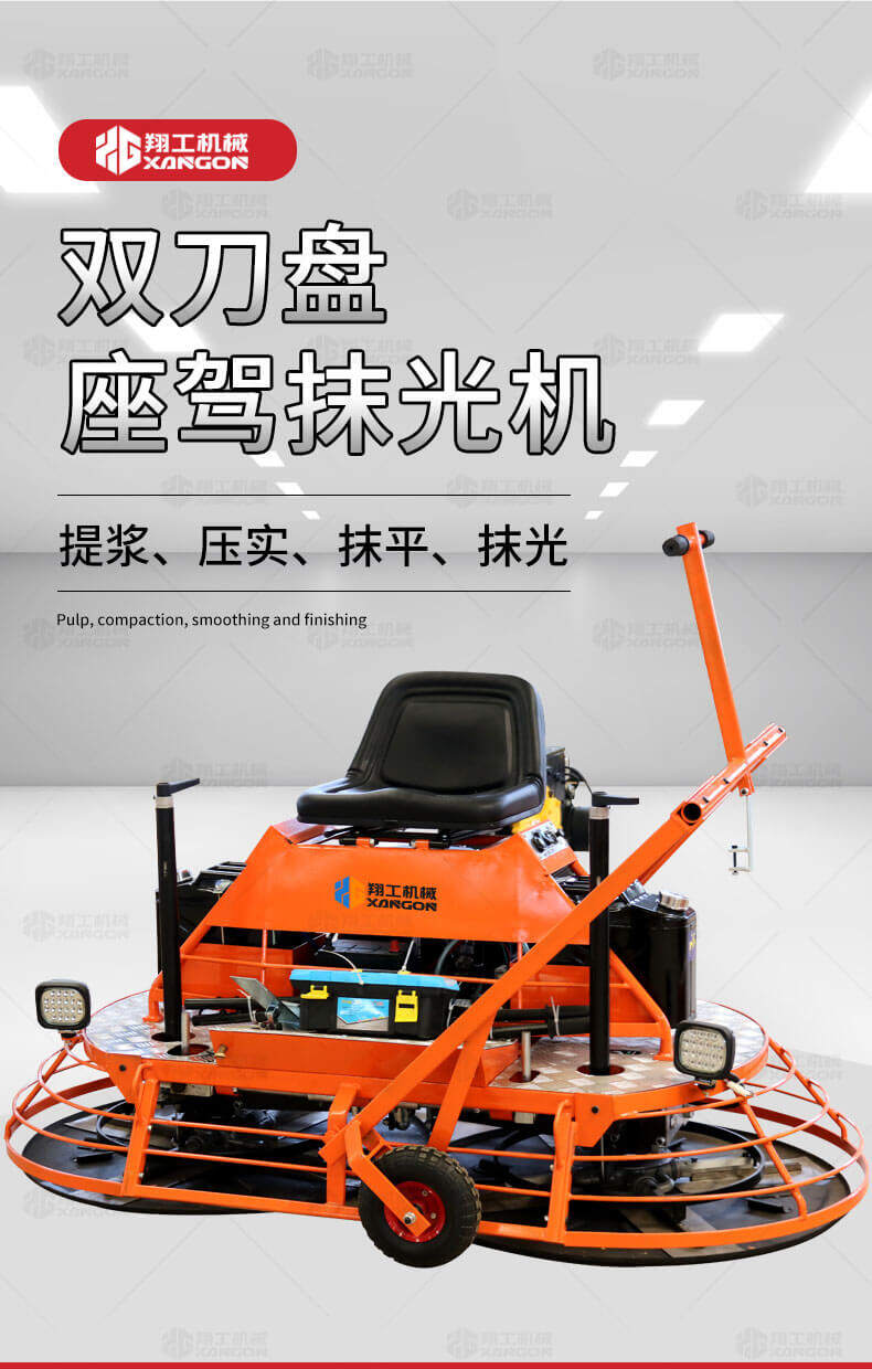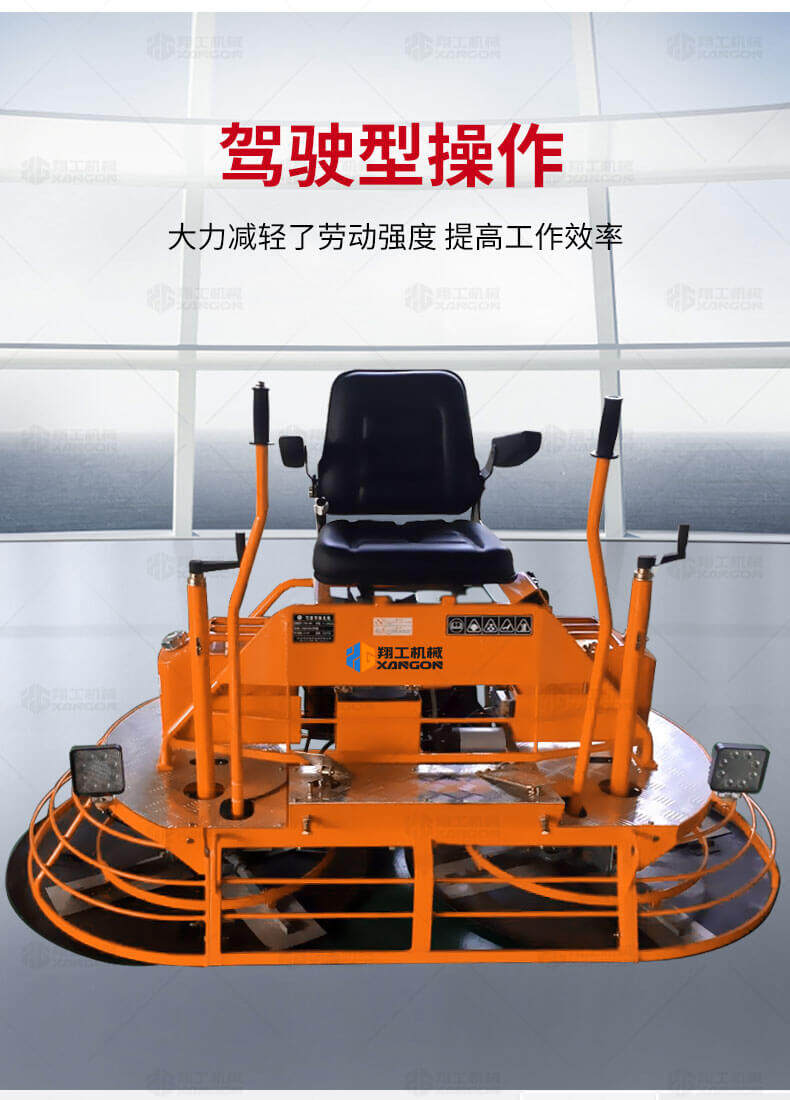 座駕式混凝土抹光機(jī)用于混凝土地面的提漿、壓實(shí)、抹平、抹光,相對(duì)于手扶式抹光機(jī),效率高。