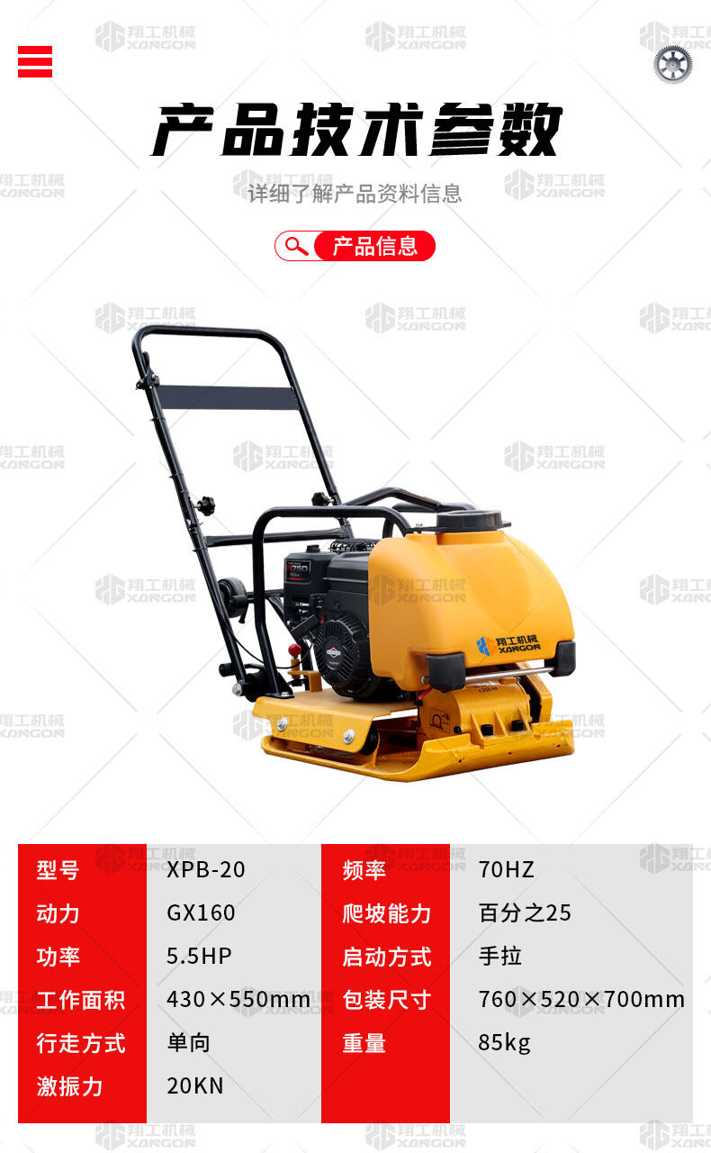 單向平板夯XPB-20適用于路基邊緣、橋涵、管道、溝槽底部等狹長(zhǎng)地帶的壓實(shí)。 HONDA動(dòng)力,性能優(yōu)越,啟動(dòng)容易 采用單獨(dú)懸掛式強(qiáng)力減震機(jī)構(gòu),減少對(duì)發(fā)動(dòng)機(jī)的沖擊,提高操作人員的舒服感;