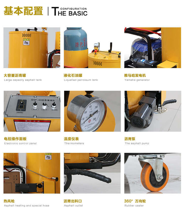60升瀝青灌縫機(jī)采用名優(yōu)發(fā)電機(jī),性能穩(wěn)定;液化氣加熱,方便靈活;超大瀝青罐;出料管路全程加熱,避免堵塞。