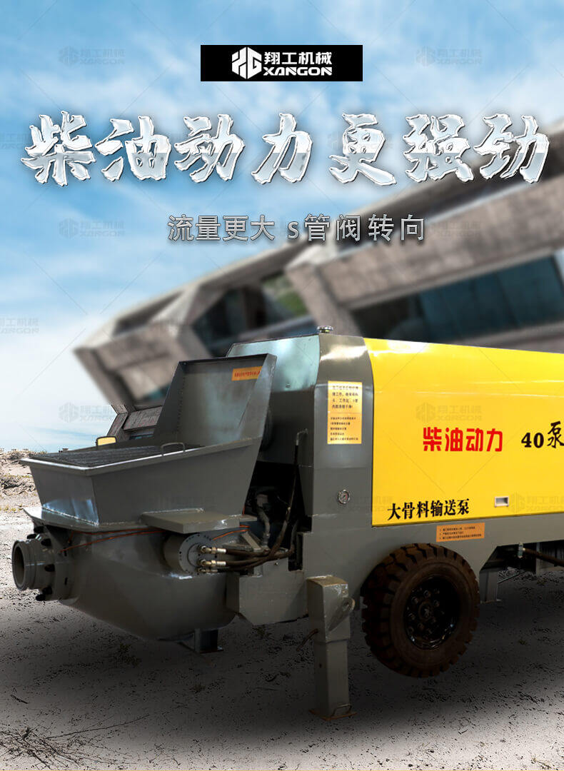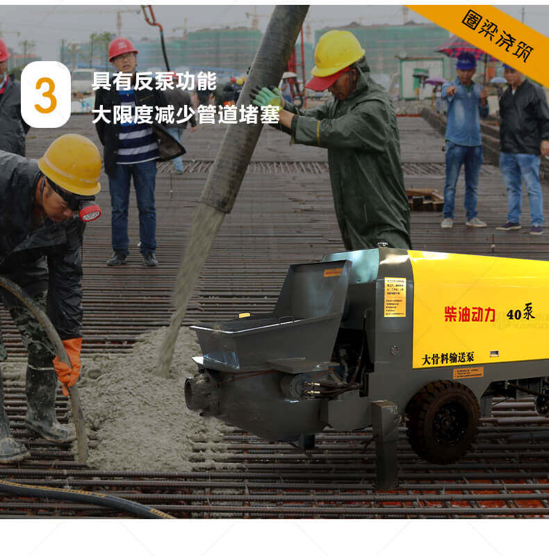 大骨料混凝土輸送泵主要用于坡道灌漿、水平地面、隧道澆筑。模板灌漿等。移動便捷全部采用快接式管道卡,提高工作效率 。