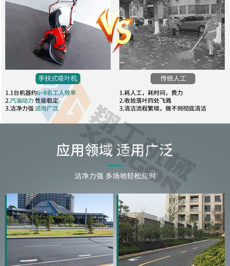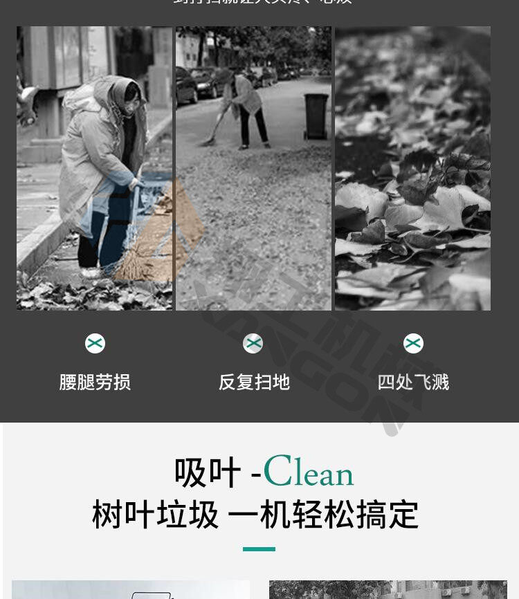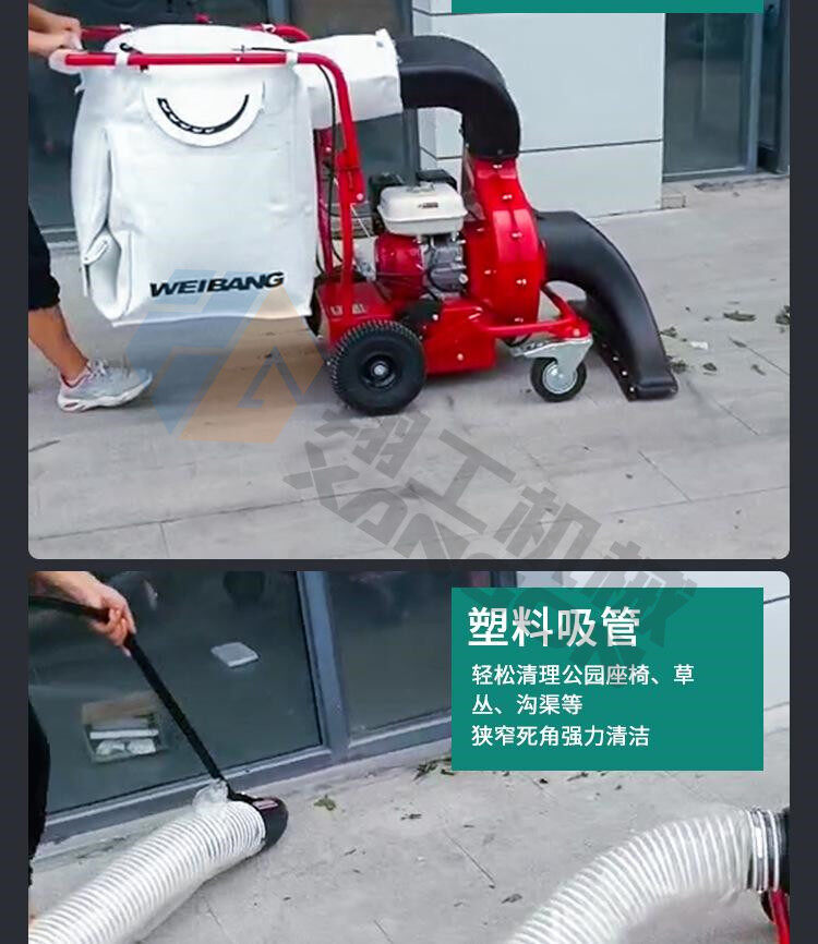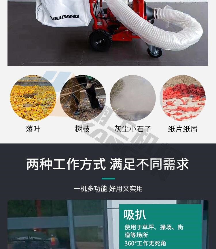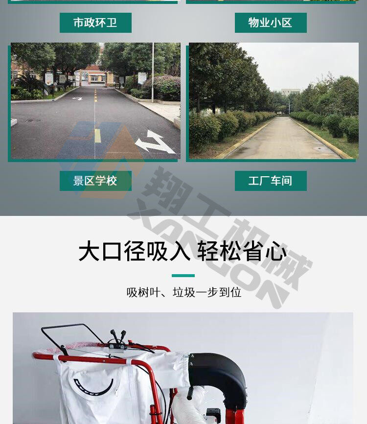 該設(shè)備工作效率高,比人工清掃效率高幾倍,可手推助力行走。垃圾儲(chǔ)存袋采用便捷式方式,便于更換垃圾,且使用成本較低。吸口可配置延長管,用來吸收綠化帶中的落葉和垃圾。吸口高度可調(diào),面對(duì)落葉較厚或大的法桐樹葉較多的區(qū)域,也能輕松收集干凈。目前以用在環(huán)衛(wèi)人行道、園林、物業(yè)小區(qū)、校園、公園、廣場、工廠廠區(qū)和車間等得到廣泛應(yīng)用。