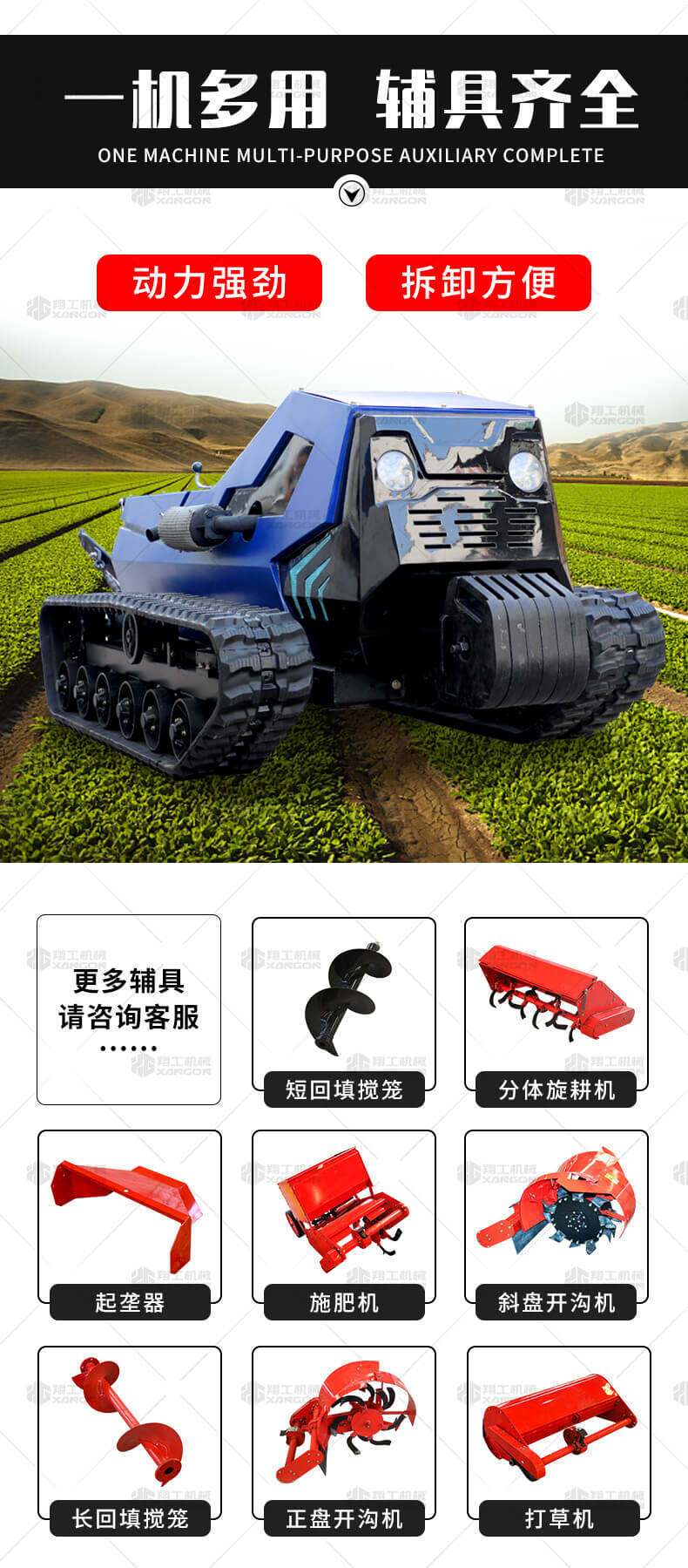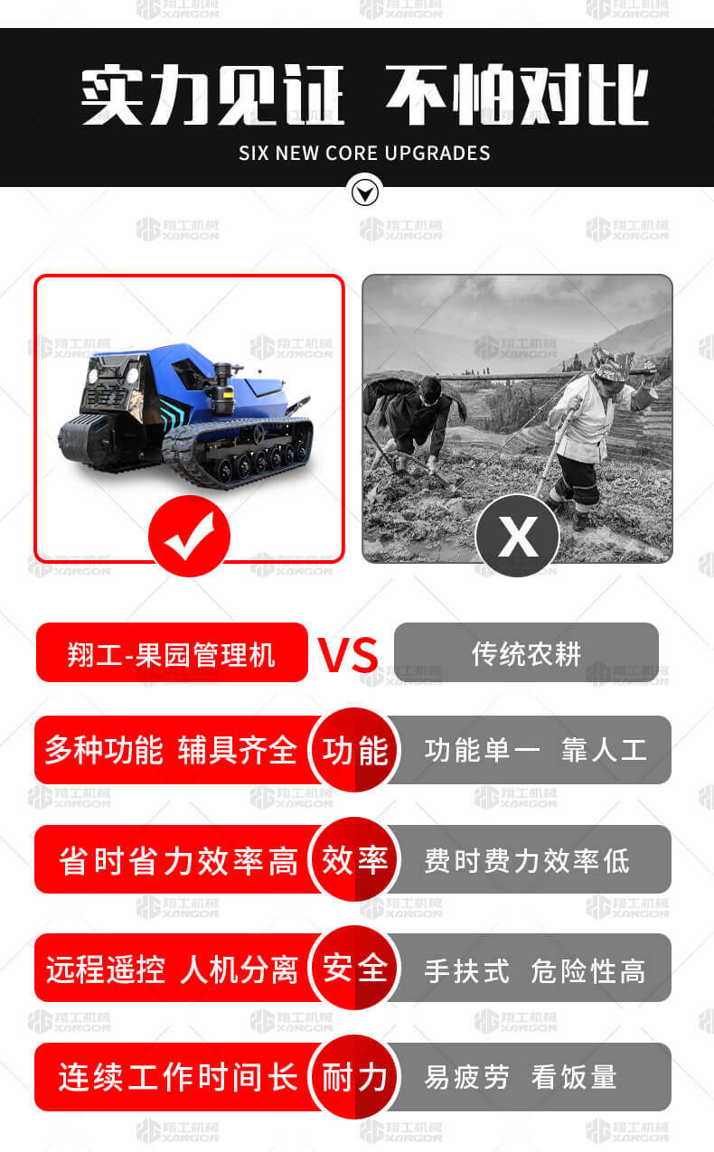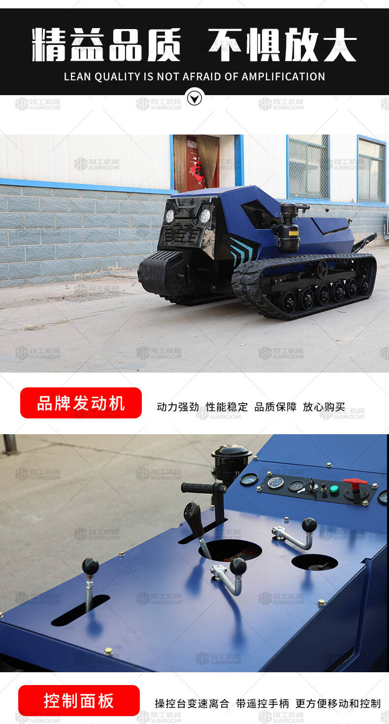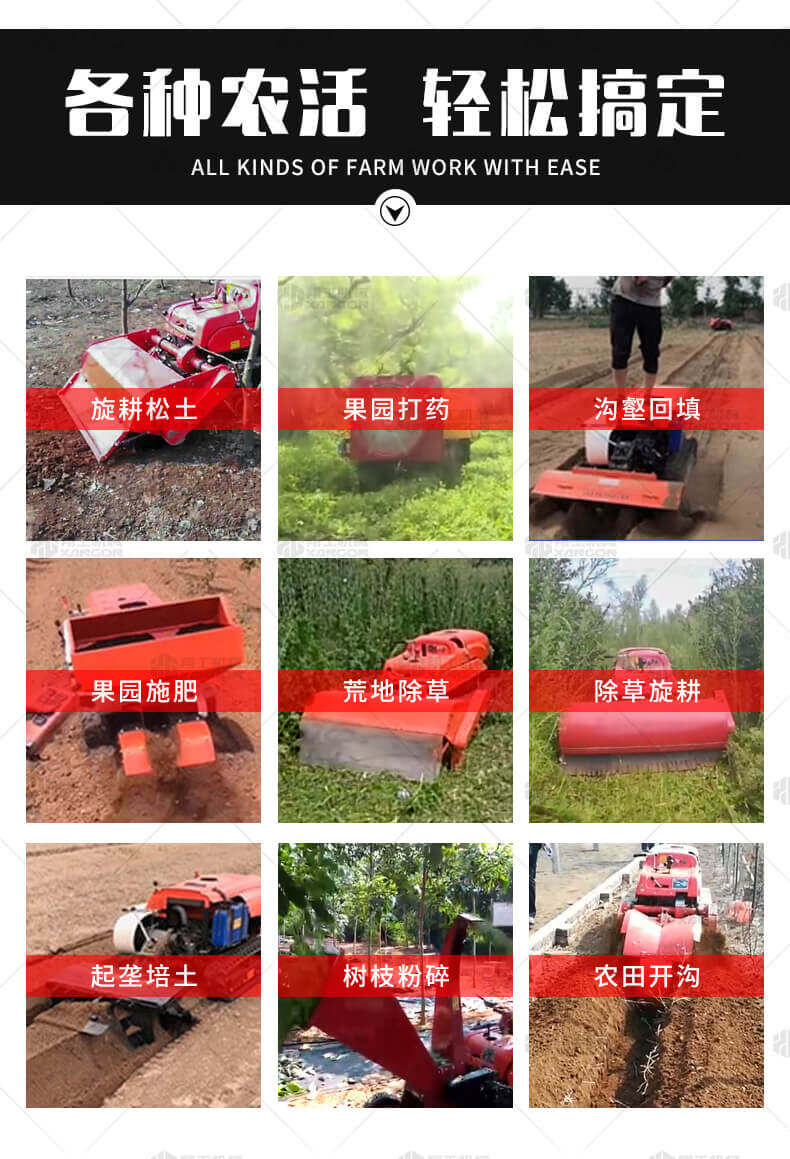本產(chǎn)品采用履帶式驅(qū)動設(shè)計,穩(wěn)定性和爬坡能力較強(qiáng),適應(yīng)丘陵山地平原各種地形,機(jī)型小功率大,適應(yīng)各種行距的果樹,大棚,園林。產(chǎn)品動力強(qiáng)勁,結(jié)實耐用,性能優(yōu)越,安全放心,遠(yuǎn)程操控,省心省力。
