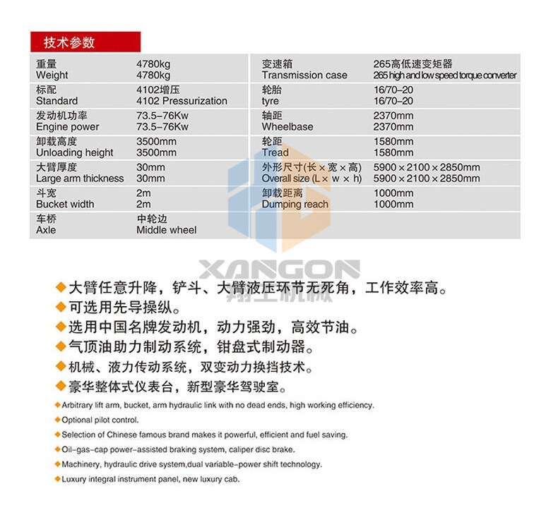 主要用于鏟裝土壤、砂石、石灰、煤炭等散狀物料,也可對礦石、硬土等作輕度鏟挖作業(yè)。換裝不同的輔助工作裝置還可進行推土、起重和其他物料如木材的裝卸作業(yè)。在道路、特別是在高等級公路施工中,裝載機用于路基工程的填挖、瀝青混合料和水泥混凝土料場的集料與裝料等作業(yè)。