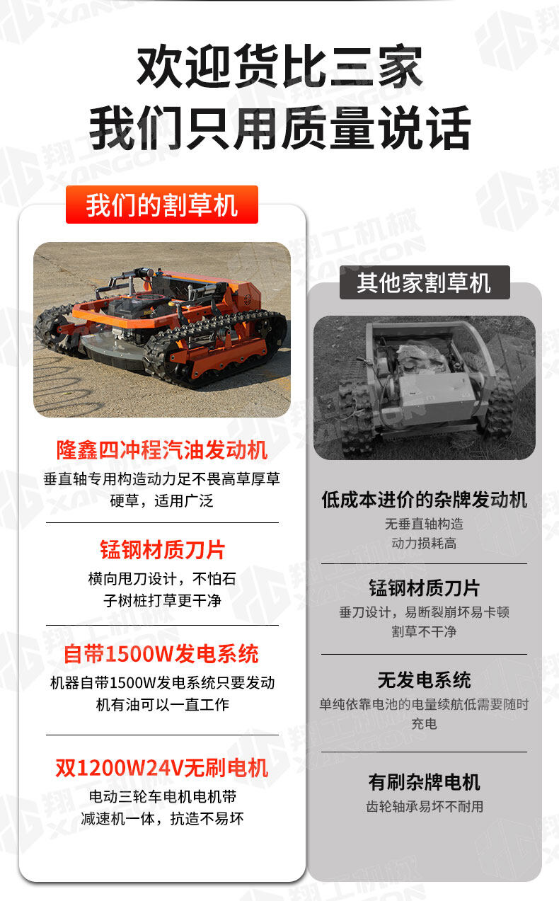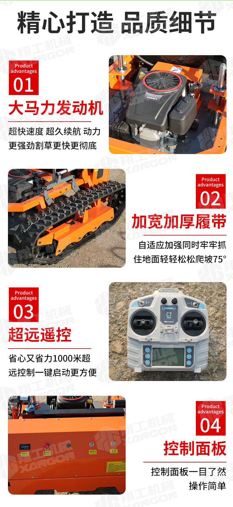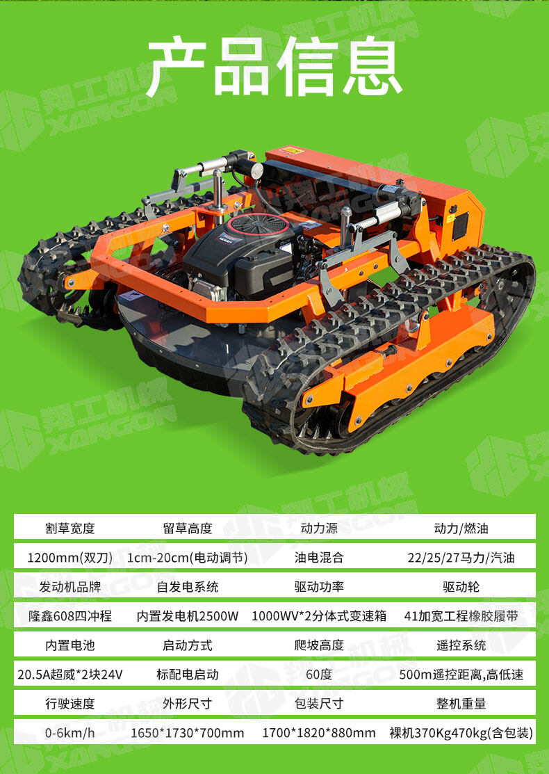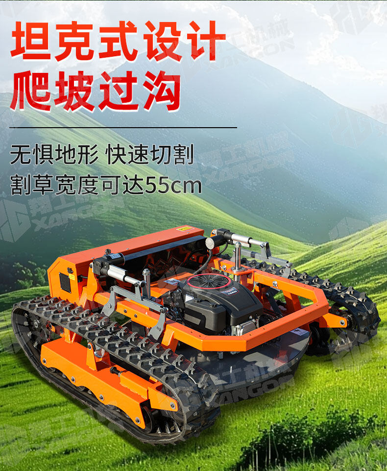 XG-1200是一款革新性的遙控坦克割草機(jī),專為復(fù)雜地形設(shè)計(jì)。其獨(dú)特的橡膠履帶底盤,具備卓越的越野與爬坡能力,輕松應(yīng)對(duì)陡坡、濕滑及不平整草坪。無線遙控操作,靈活精準(zhǔn),極大提升了割草效率與安全性,是果園、荒地及專業(yè)園藝工作的理想之選。