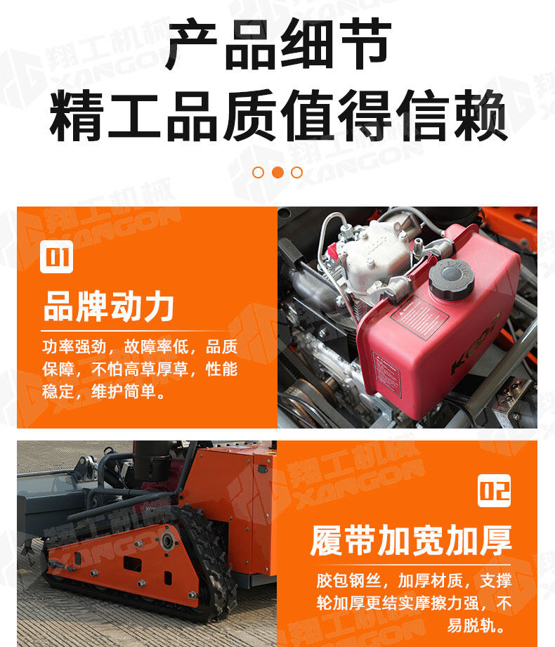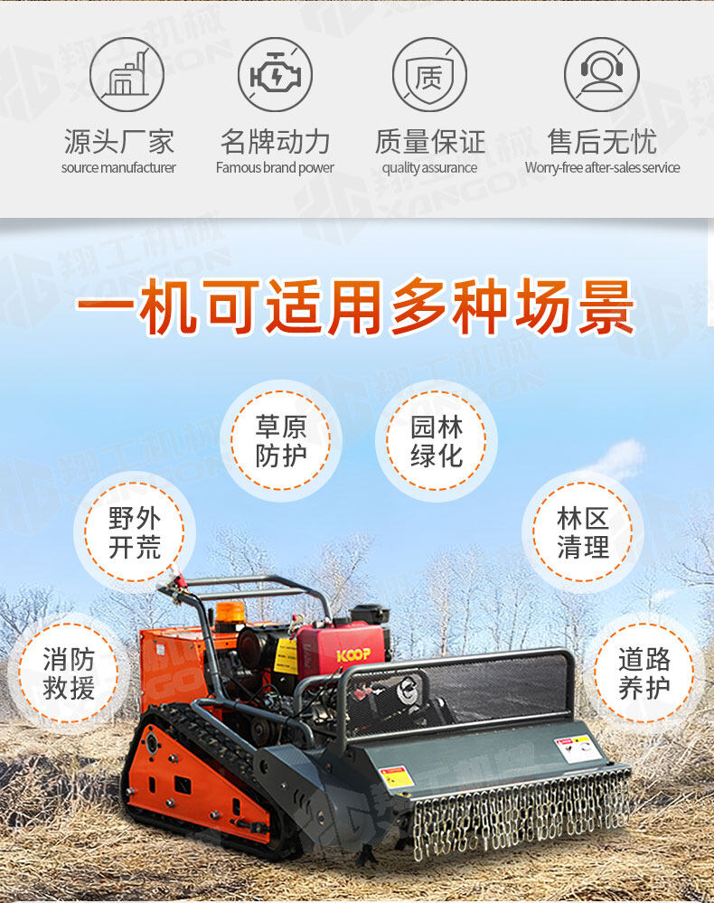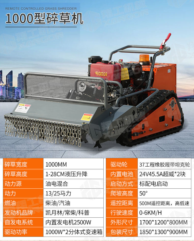 XG-1000遙控碎草機(jī),是一款革新園林養(yǎng)護(hù)的智能裝備。它融合遠(yuǎn)程遙控與自主碎草功能,操作便捷省力。設(shè)備動(dòng)力強(qiáng)勁,碎草細(xì)膩,能直接將雜草轉(zhuǎn)化為有機(jī)綠肥,促進(jìn)草坪健康生長(zhǎng)。適用于大型草坪、莊園及專業(yè)綠地,作業(yè)高效,是提升養(yǎng)護(hù)品質(zhì)、實(shí)現(xiàn)綠色循環(huán)的理想選擇。